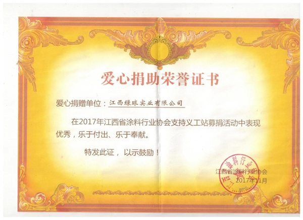 In November 2017, he participated in public welfare and charity in the fundraising activity of the Jiangxi Paint Industry Association to support the volunteer station, and won the honorary certificate of love donation.